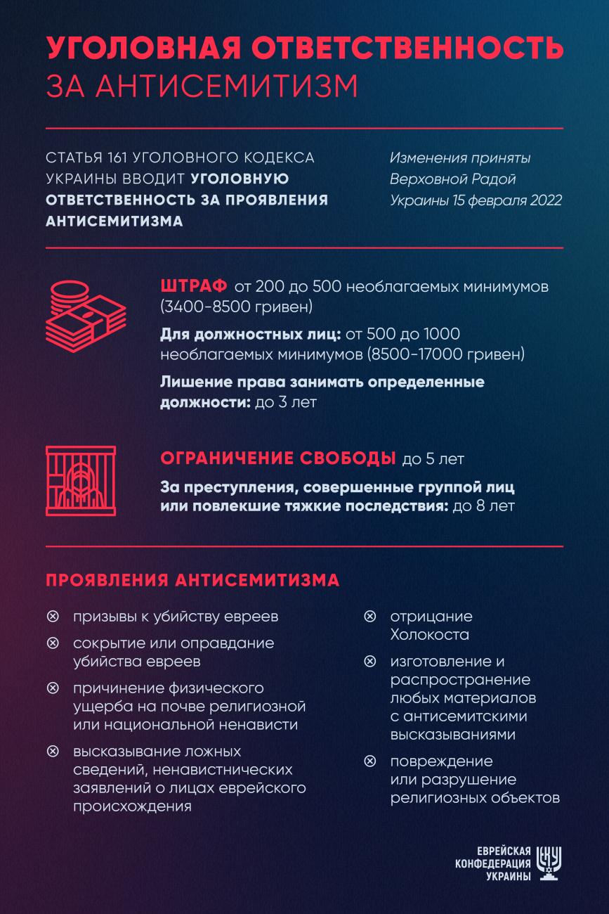 Закон о противодействии антисемитизму, принятый Верховной Радой в сентябре прошлого года, теперь сможет начать работать в полном объеме - парламент поставил логичную точку, установив уголовную ответственность за проявления антисемитизма, - написал президент Еврейской конфедерации Украины Борис Ложкин в Facebook.